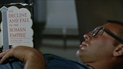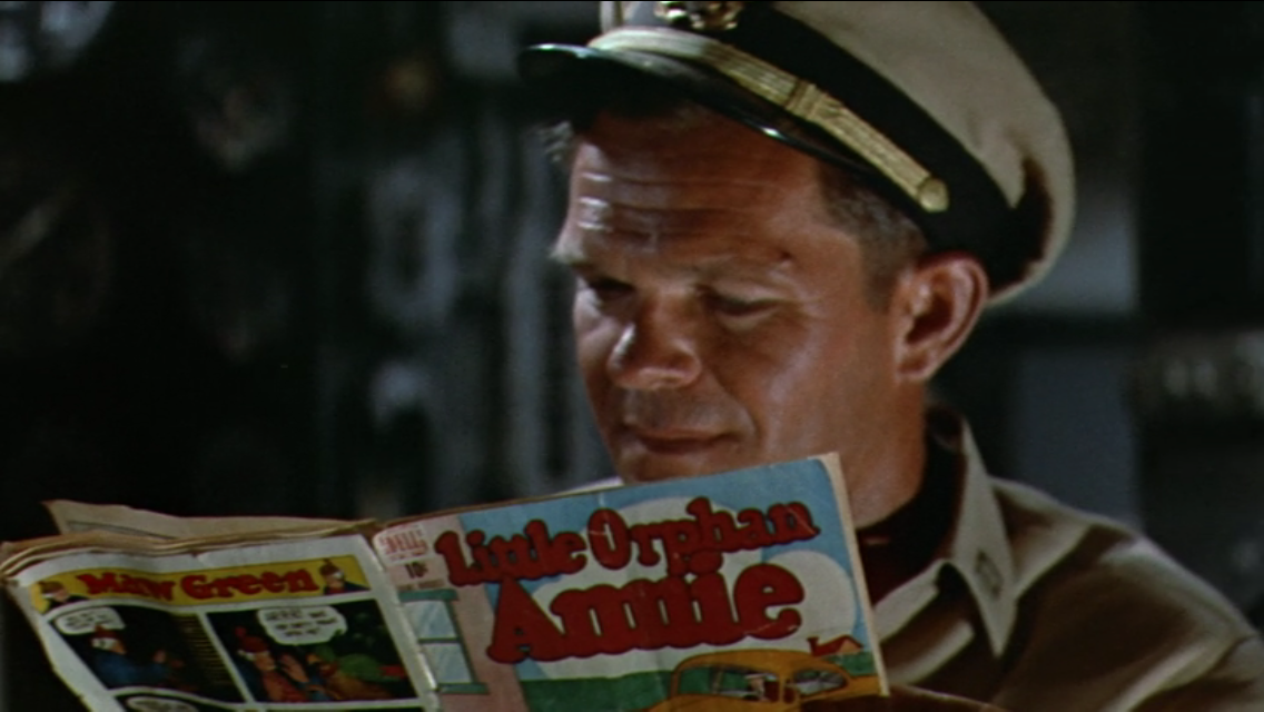Since I love seeing books used in shows and movies, I thought I'd share a few screenshots from 1957's movie The Enemy Below. The story follows a cat-and-mouse game between an American destroyer and a German U-Boat during World War II (and is currently available on Netflix). The following screenshots take place about an hour into the movie. The U-Boat is resting on the ocean floor, at 1,000 feet depth, while the destroyer is directly over it. Both vessels are trying to remain completely silent. The camera pans through the American destroyer first and we see one of the sailors engaged in some serious reading.